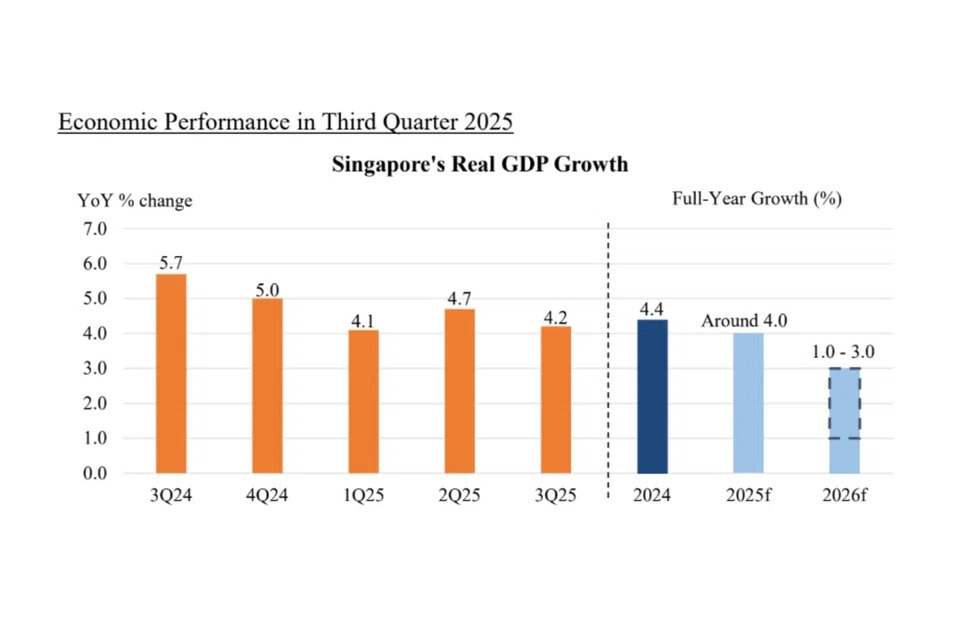 MTI said GDP growth for the first three quarters of 2025 averages at 4.3 per cent year on year. That average is just shy of the 4.4 per cent growth Singapore achieved in the whole of 2024.