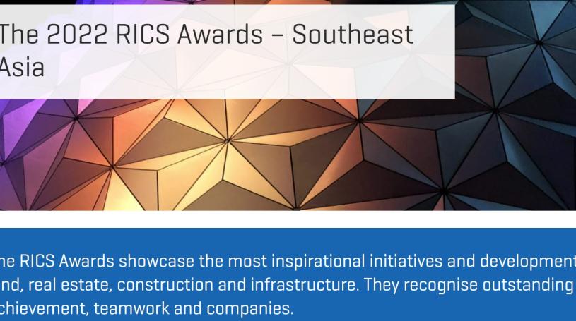 The 2022 RICS Awards Southeast Asia (https://bit.ly/3tBEne9) bestow both local and global recognition. They recognise industry-leading achievements and demonstrate the upholding of the highest standards of professionalism and ethics by individuals and teams across the built and natural environments.