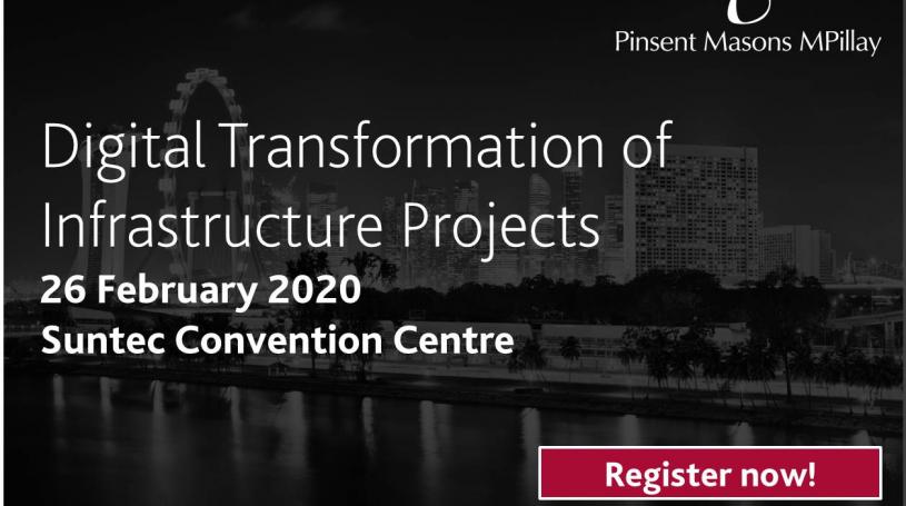 Pinsent Masons MPillay is delighted to invite you to our conference focussing on the Digital Transformation of Infrastructure Projects. This event will bring together senior individuals from across the Infrastructure sector, joined by renowned specialists from the industry. In our feature panel, our experts will discuss the opportunities and issues that arise from digital transformation, while touching on the results of the recent Pinsent Masons Global Infrastructure survey.